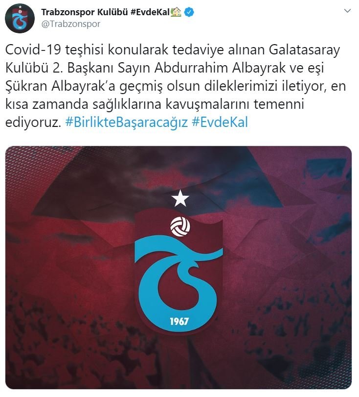 Öte yandan Trabzonspor da Abdurrahim Albayrak'a geçmiş olsun dileklerinde bulundu. Bordo-mavili kulüpten yapılan paylaşımda, "Covid-19 teşhisi konularak tedaviye alınan Galatasaray Kulübü 2. Başkanı Sayın Abdurrahim Albayrak ve eşi Şükran Albayrak'a geçmiş olsun dileklerimizi iletiyor, en kısa zamanda sağlıklarına kavuşmalarını temenni ediyoruz" denildi.