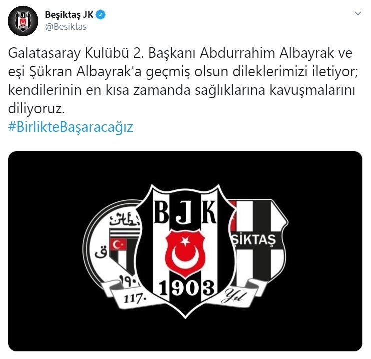 Beşiktaş da Galatasaray İkinci Başkanı Abdurrahim Albayrak için geçmiş olsun mesajı paylaştı. Siyah-beyazlı kulüpten paylaşılan gönderide, "Galatasaray Kulübü 2. Başkanı Abdurrahim Albayrak ve eşi Şükran Albayrak'a geçmiş olsun dileklerimizi iletiyor; kendilerinin en kısa zamanda sağlıklarına kavuşmalarını diliyoruz" ifadelerine yer verildi.