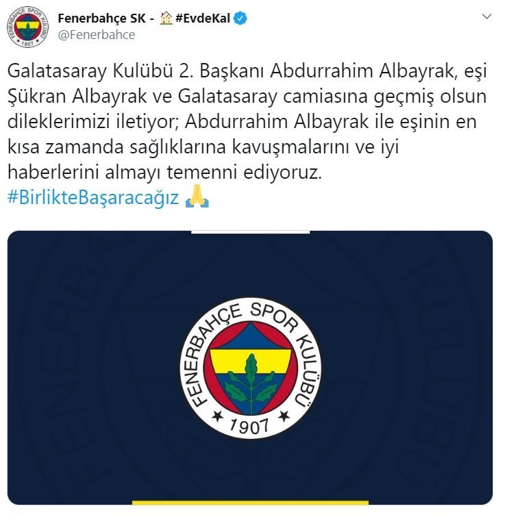Galatasaray, 2. Başkanı Abdurrahim Albayrak'ın sağlık durumu ile ilgili bir açıklama yaptı. Yapılan son dakika açıklamasında Albayrak ve eşinin corona virüsü testinin pozitif çıktığı ve tedavilerinin olumlu yönde seyrettiği bildirildi. Bu duyurunun üzerine Fenerbahçe'den bir geçmiş olsun mesajı paylaşıldı.