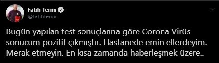 Galatasaray'da ikinci başkan Abdurrahim Albayrak'ın corona virüsü testinin pozitif çıkmasının ardından ikinci bir şok da Fatih Terim'den geldi. Deneyimli teknik adam sosyal medya hesabından yaptığı açıklamada Kovid-19 testinin pozitif çıktığını ve hastanede olduğunu belirtti.