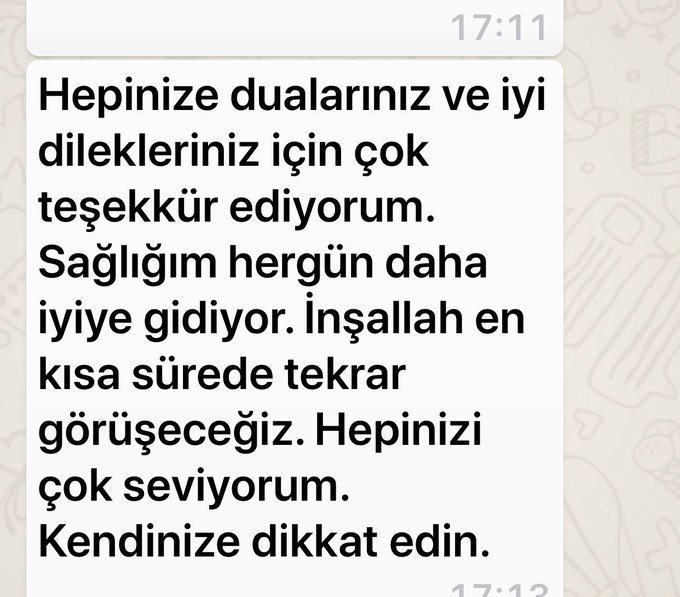 Albayrak, yaptığı açıklamada sağlığının iyiye gittiğini ifade ederken, "Hepinize dualarınız ve iyi dilekleriniz için çok teşekkür ediyorum. Sağlığın her gün daha iyiye gidiyor. İnşallah en kısa sürede tekrar görüşeceğiz. Hepinizi çok seviyorum. Kendinize dikkat edin." dedi.