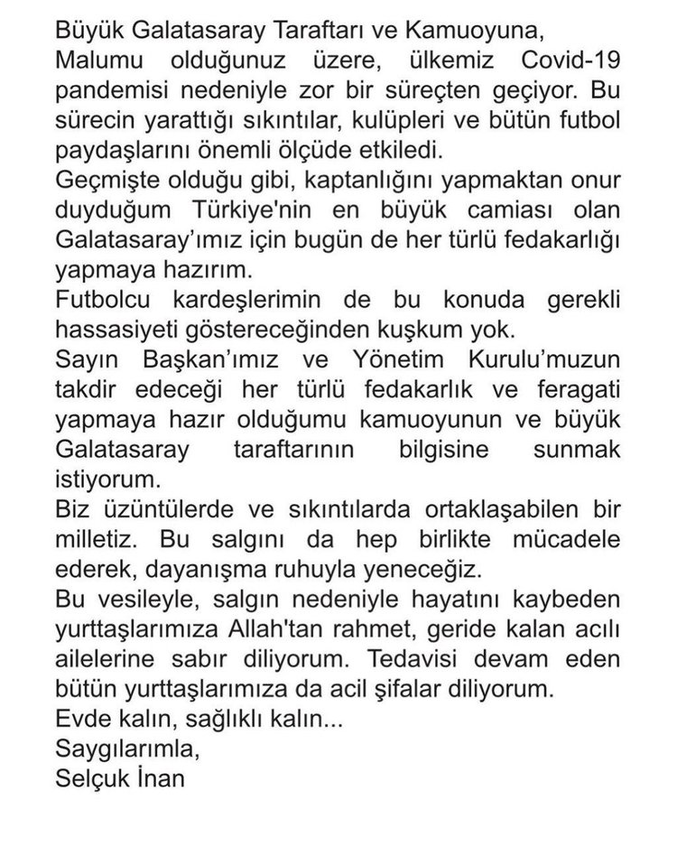 "Bu sürecin yarattığı sıkıntılar, kulüpleri ve bütün futbol paydaşlarını önemli ölçüde etkiledi. Geçmişte olduğu gibi, kaptanlığını yapmaktan onur duyduğum Türkiye'nin en büyük camiası Galatasaray'ımız için bugün de her fedakarlığı yapmaya hazırım. Futbolcu kardeşlerimin de bu konuda gerekli hassasiyeti göstereceğinden kuşkum yok. Sayın Başkanımız ve Yönetim Kurulumuzun takdir edeceği her türlü fedakarlık ve feragati yapmaya hazır olduğumu kamuoyunun ve büyük Galatasaray taraftarının bilgisine sunmak istiyorum."