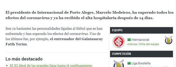 Brezilya basınından es.besoccer, Internacional Kulübü Başkanı Marcelo Medeiros'un 14 günde corona virüsünü yendiği haberini takipçileriyle paylaşırken, Terim'in virüsü yenmesini örnek gösterdi.