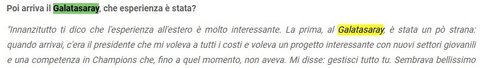 "Her şeyden önce yurt dışı deneyimimin çok ilginç olduğunu söylemek istiyorum. Galatasaray'da ki deneyimimim biraz garipti. Geldiğimde, beni her ne pahasına olursa olsun isteyen ve ilginç bir proje ile isteyen başkan vardı. Şampiyonlar Ligi'nde o zamana kadar sahip olmadığı bir beceri söz konusuydu. Bana şunu dedi: 'Elindeki her şeyi yönet.' Çok güzel görünüyordu, bakıldığında öyle değil mi? Sonra istifa etti. Çünkü bazı projelerini paylaşmadı. Diğer insanlar yanıma geldiler ve beni ikna ettiler. Sonra, sıralamada 2. oldum ve beni kovdular. Bu yüzden şunu söyleyebilirim; İnsani bakış açısından iyi bir deneyim ancak profesyönel bakış açısından oldukça kötü."