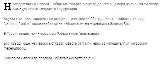 Kısa süre önce Galatasaray'ın gündemine gelen Levski Sofya'nın golcüsü Nigel Robertha ile ilgili çıkan haberlerde oyuncunun transferinin birkaç gün içinde gerçekleşebileceği ifade edildi.