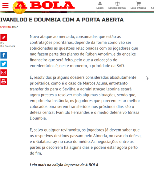 Sporting Lisbon teknik patronu Ruben Amorim, yeni sezon öncesi Doumbia'yı kampa götürmezken, Galatasaray'ın Jean Michael Seri ile anlaşılamaması durumunda oyuncu ile temasa geçmesi bekleniyor.