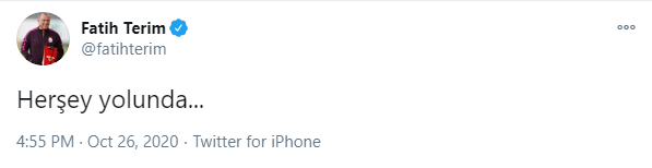 Toplantıdan ayrılmasının ardından Abdurrahim Albayrak ile bir görüşme gerçekleştiren Fatih Terim, sosyal medyadan bir mesaj yayınlayarak her şeyin yolunda olduğunun sinyalini verdi.