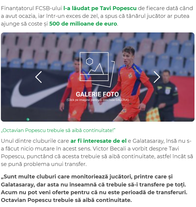 Galatasaray'da Terim'in ısrarla istediği isimlerden biri olan Octavian Popescu için Basel kulübünün sahibi Gigi Becali açıklamalarda bulundu. 18 yaşındaki oyuncudan övgüyle bahseden Becali, ileride 500 milyon Euro edebileceğini söyledi.
