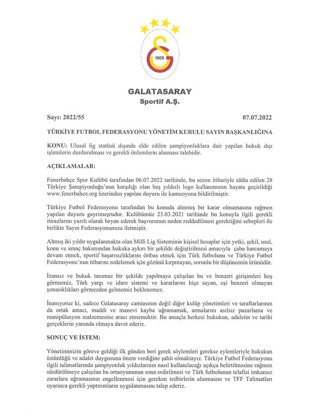 Yönetiminizin göreve geldiği ilk günden beri gerek söylemleri gerekse eylemleriyle hukukun üstünlüğü ve adalet duygusuna önem verdiğine şahit olmaktayız. Türkiye Futbol Federasyonu ilgili talimatlannda şampiyonluk yıldızlarının nasıl kullanılacağı açıkça belirtilmesine rağmen sürdürülmeye çalışılan bu ortaoyununun sona erdirilmesi ve Türk futbolunun telafisi imkansız zararlara uğramasının engellenmesi için gereken tedbirlerin alınmasını ve TFF Talimatlan uyarınca gerekli yaptırımların uygulanmasını talep ederiz."
