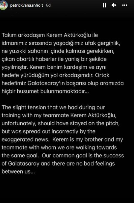 Hollandalı futbolcu, antrenmanda yaşanan olayla ilgili yaptığı paylaşımda, "Takım arkadaşım Kerem Aktürkoğlu ile idmanımız sırasında yaşadığımız ufak gerginlik, ne yazık ki sahanın içinde kalması gerekirken, çıkan abartılı haberler ile yanlış bir şekilde yayılmıştır. Kerem benim kardeşim ve aynı hedefe yürüdüğüm yol arkadaşımdır. Ortak hedefimiz Galatasaray'ın başarısı olup aramızda hiçbir husumet bulunmamaktadır." ifadelerini kullandı.