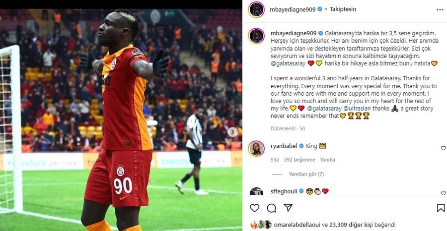 Sosyal medya hesabı üzerinden bir paylaşım yapan Senegalli golcü, "Galatasaray'da harika bir 3.5 sene geçirdim. Sizi çok seviyorum ve sizi hayatımın sonuna kadar kalbimde taşıyacağım" ifadelerini kullandı.