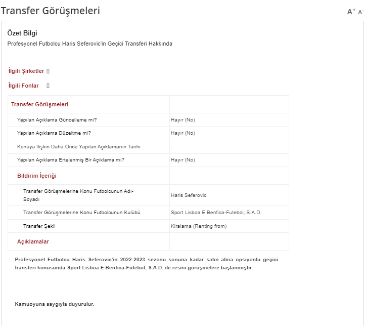 Profesyonel Futbolcu Haris Seferovic'in 2022-2023 sezonu sonuna kadar satın alma opsiyonlu geçici transferi konusunda Sport Lisboa E Benfica-Futebol, S.A.D. ile resmi görüşmelere başlanmıştır.