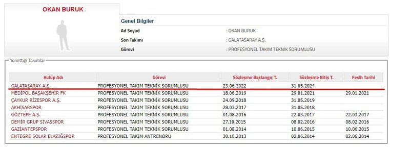 Spor Toto Süper Lig'in 2022-2023 sezonunda şampiyonluğa ulaşan Galatasaray, Teknik Direktör Okan Buruk'un sözleşmesinde bulunan opsiyonu kullanarak, 31 Mayıs 2024 tarihine kadar uzatıldığını Türkiye Futbol Federasyonu'na bildirdi. Sarı-kırmızılı takımın başına sezon başında geçen Buruk, Galatasaray'a 2018-2019 sezonundan sonra şampiyonluk sevinci yaşattı.
