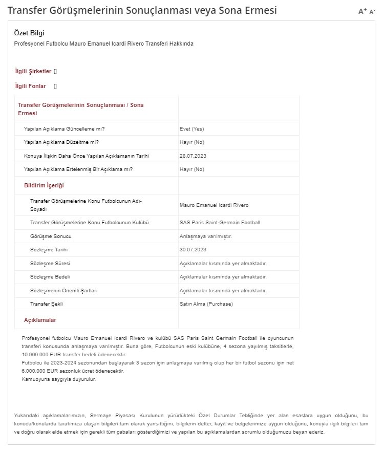 Profesyonel futbolcu Mauro Emanuel Icardi Rivero ve kulübü SAS Paris Saint Germain Football ile oyuncunun transferi konusunda anlaşmaya varılmıştır. Buna göre, futbolcunun eski kulübüne, 4 sezona yayılmış taksitlerle, 10.000.000 EUR transfer bedeli ödenecektir. Futbolcu ile 2023-2024 sezonundan başlayarak 3 sezon için anlaşmaya varılmış olup her bir futbol sezonu için net 6.000.000 EUR sezonluk ücret ödenecektir.