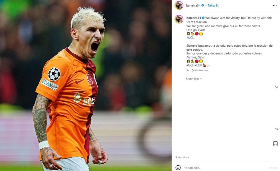 Lucas Torreira gönderisinde, "Her zaman zaferi hedefliyoruz ama bu takımın gösterdiği reaksiyondan dolayı mutluyum." dedi.