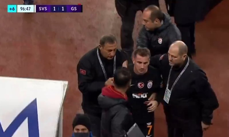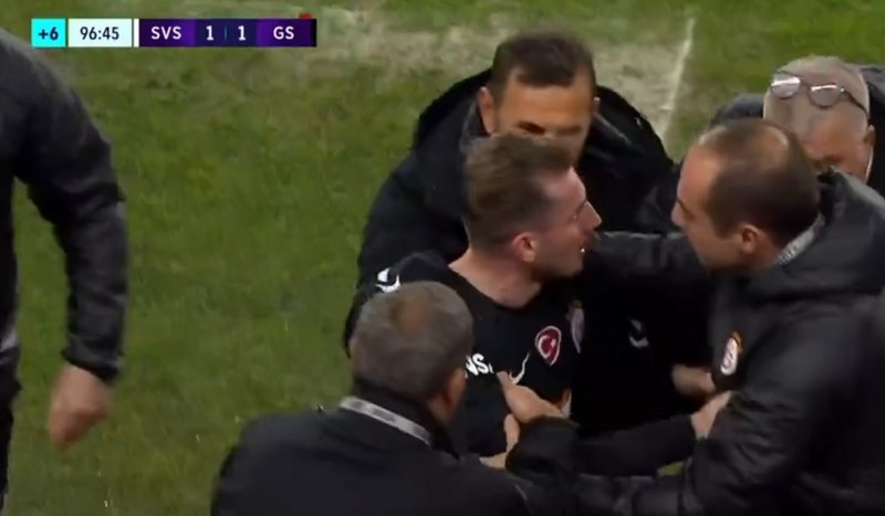 Hakemin kararına çok sinirlenen Kerem'i Okan Buruk ve teknik ekip sakinleştirmeye çalıştı.