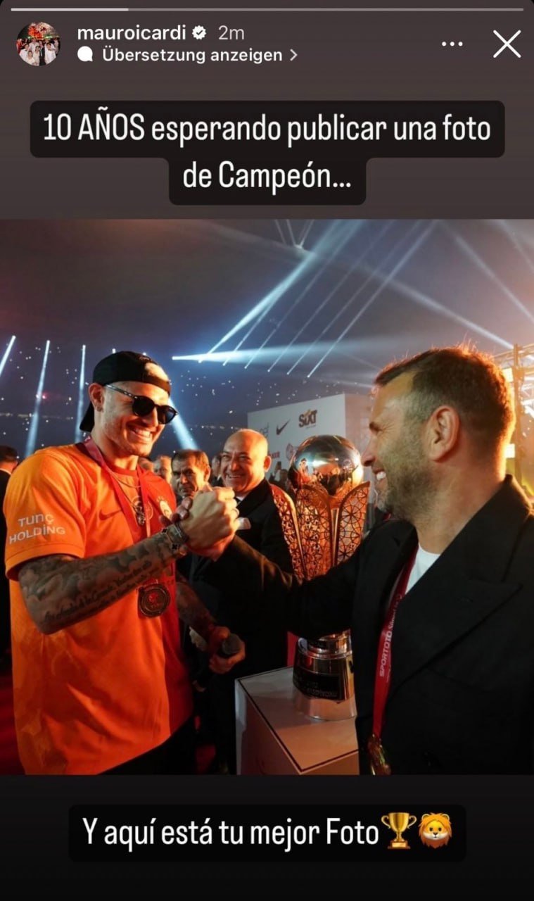 Sarı-lacivertlilere şampiyonluk göndermesi yapan Icardi, paylaşımda Fenerbahçe için "Şampiyonluk için 10 yıldır bekliyorsunuz. İşte şampiyonluk fotoğrafı" ifadelerini kullandı.