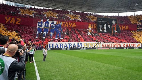 Rams Park dün tarihi günlerinden birini yaşadı. 50 bin taraftar yeri göğü sarı kırmızıya boyadı. G.Saray taraftarı özel koreografi hazırladı. İki bölüm halinde gerçekleştirilen koreografide doğu tribününe kartonlarla "Mayıslar Bizimdir" yazıldı. Kuzey tribünündeki üç boyutlu koreografide ise şampiyonluk vurgusu yapıldı. Fenerbahçe'nin 10 sezonluk şampiyonluk hasretine atıfta bulunulan şovda, "Yaz tahtaya bir daha" yazısı açıldı. Büyük görselde Okan Buruk, ders tahtası önünde resmedildi. Tahtada "Ders: Tarih, Konu: Şampiyonluk" yazısı altında geçen sezon alınan lig şampiyonluğu ve bu sezon kazanılan Süper Kupa'ya yer verildi. F.Bahçeli bazı futbolcuların resmi altında, "Hababam Sınıfı Sınıfta Kaldı" yazısıyla gönderme yapıldı. Mertens'in oğlu Ciro'nun F.Bahçeli futbolculara gülerken yer aldığı resmi vardı.