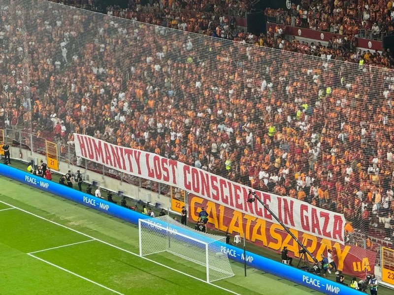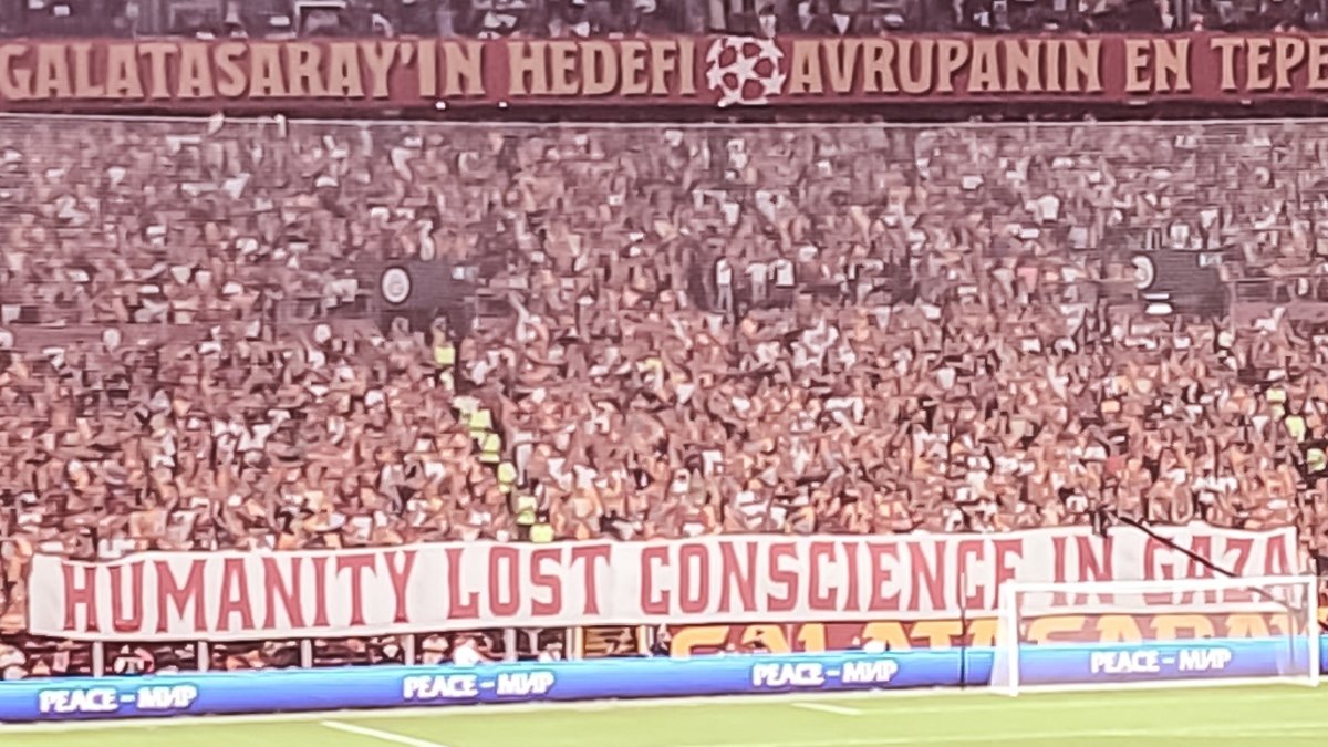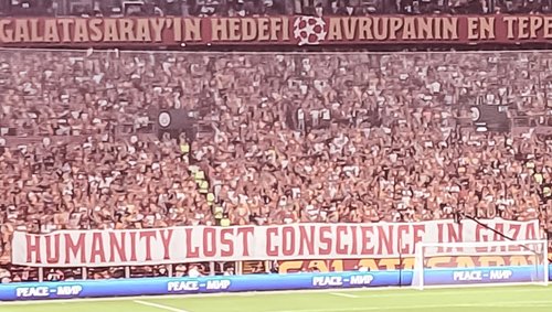 Sarı-kırmızılı taraftarlar tribünde açtığı pankartla Gazze'ye destek verdi. Hazırlanan pankartta, "İnsanlık Gazze'de vicdanını kaybetti" ifadeleri yer aldı.