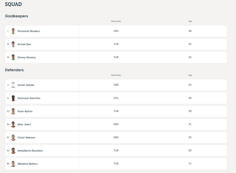 Defans: Ismail Jakobs, Davinson Sánchez, Kaan Ayhan, Elias Jelert, Victor Nelsson, Abdülkerim Bardakcı, Metehan Baltacı.
