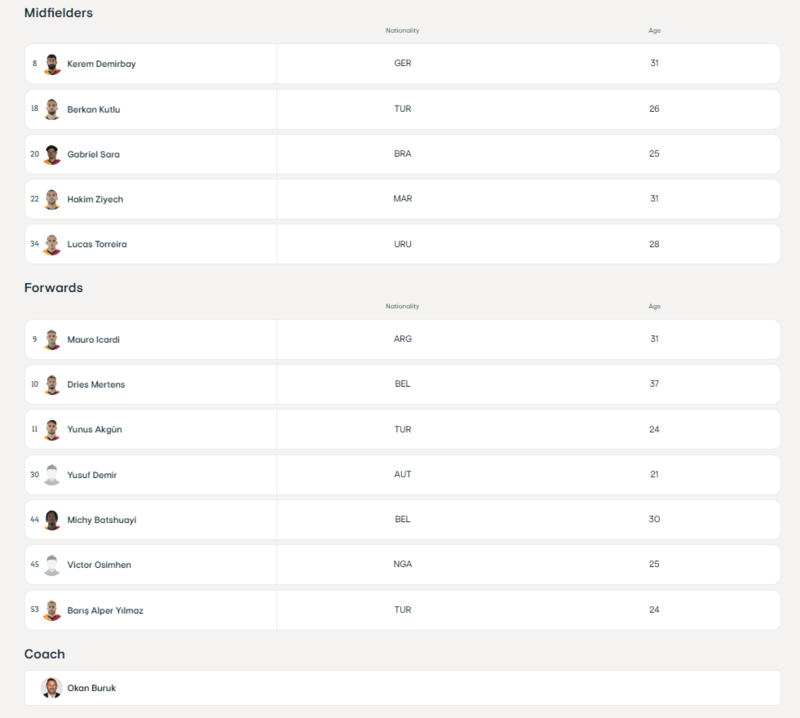 Forvet: Mauro Icardi, Dries Mertens, Yunus Akgün, Yusuf Demir, Michy Batshuayi, Victor Osimhen, Barış Alper Yılmaz.