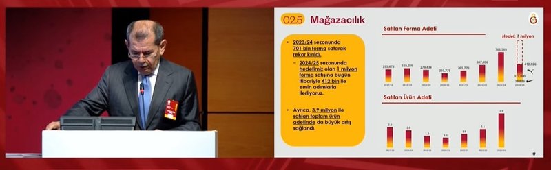 Mağazacılık... Sürekli büyüme halini 79 milyon euro'luk bir ciro ile rekor kırarak devam ediyoruz. Geçen sezon 701 bin forma satış rakamına ulaştık. Tüm zamanların rekorunu kırdık. Bu sene 412 bin forma sattık. 1 milyon forma satış hedefi için çalışıyoruz. Her Galatasaraylının orijinal forma alarak bu hedefe katkı sağlamasını hedefliyoruz.