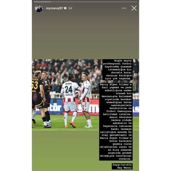 Rey Manaj yaptığı paylaşımda, "Bugün maçta profesyonel futbol hayatımda yaşamak istemediğim bir durumla karşı karşıya kaldığım için çok üzgünüm. Barış Alper Yılmaz'a faul yapmak ve ya da sakatlığına neden olacak bir davranışta bulunmak niyetinde hareket etmediğimi bütün samimiyetimle kendisine ve futbol kamuoyuna belirtmek isterim." dedi.