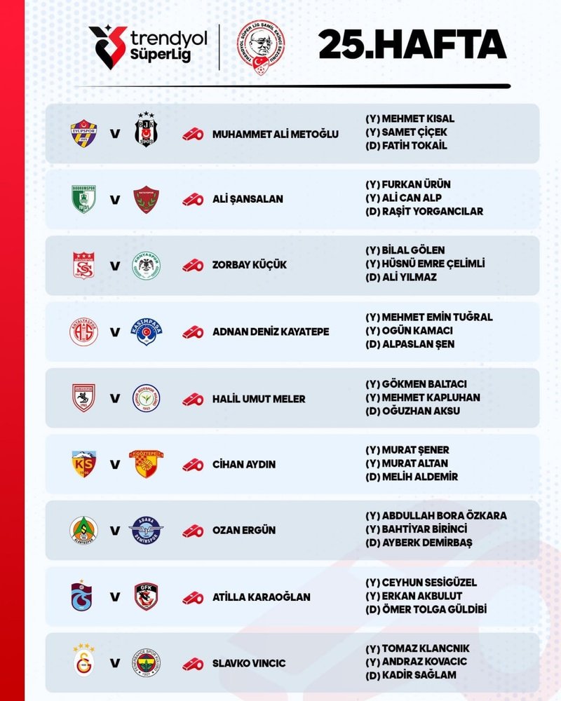Süper Lig'in 25'inci haftası 21 Şubat Cuma günü oynanacak 2 karşılaşma ile başlayacak. 24 Şubat Pazartesi günü Galatasaray'ın Fenerbahçe'yi konuk edeceği derbi karşılaşmasının da hakemi belli oldu. Pazartesi günü RAMS Park'ta saat 20.00'de başlayacak karşılaşmada Slovenya Futbol Federasyonu'ndan Slavko Vincic düdük çalacak. Vincic'in yardımcılıklarını ise Tomaz Klancnik ve Andraz Kovacic üstlenecek. Maçın 4'üncü hakemi ise Kadir Sağlam olacak. Süper Lig'de 25'inci haftanın maçları ve görev alacak hakemler şöyle:
