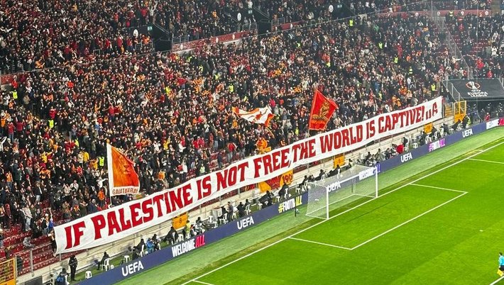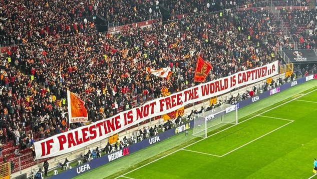 Maçta G.Saraylı taraftarlar Filistin'e destek için pankart açtı. 'Soykırımı durdurun' pankartı açan tribünler ayrıca Filistin'e destek veren İskoç ekibi Celtic'e teşekkür için bir başka pankart açtı.