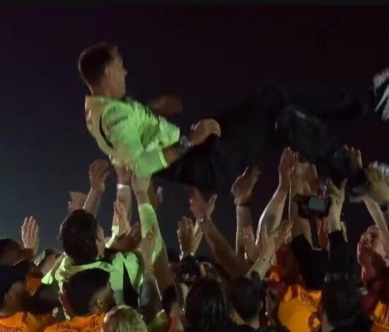 Galatasaraylı oyuncular daha sonra Muslera'yı omuzlarına aldı ve havaya fırlattı.