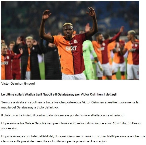 "Victor Osimhen'in Galatasaray'a kalıcı olarak dönmesi için yapılan görüşmelerde sona yaklaşıldığı görülüyor. Türk kulübü, Nijeryalı golcüye incelemesi ve imzalaması için sözleşmeyi gönderdi."