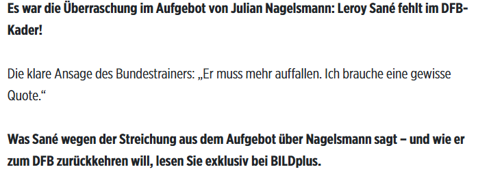 Nagelsmann'ın açıklamalarına yanıt veren 29 yaşındaki Alman futbolcu, Bild'e konuştu. Sane, milli takım arasından sonra yeni bir dönemin başlayacağını belirterek, "Milli takım arasından sonra işler gerçekten başlıyor. Ayrıca ivme kazanmak ve ritim yakalamak için haftada iki maç oynamayı çok seviyorum." ifadelerini kullandı.