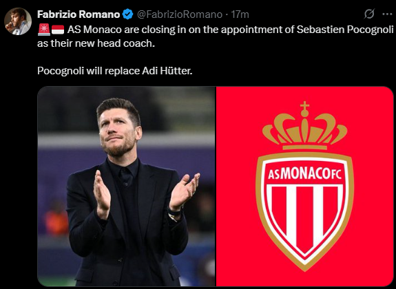 İtalyan gazeteci Fabrizio Romano'nun aktardığı habere göre Monaco, teknik direktörlük görevine Union Saint-Gilloise'ın çalıştırıcısı Sebastien Pocognoli'yi getirmeye hazırlanıyor. Haberde, iki taraf arasında yapılan görüşmelerde sona yaklaşıldığı ve Pocognoli'nin kısa süre içinde Adi Hütter'in yerini almasının beklendiği ifade edildi.