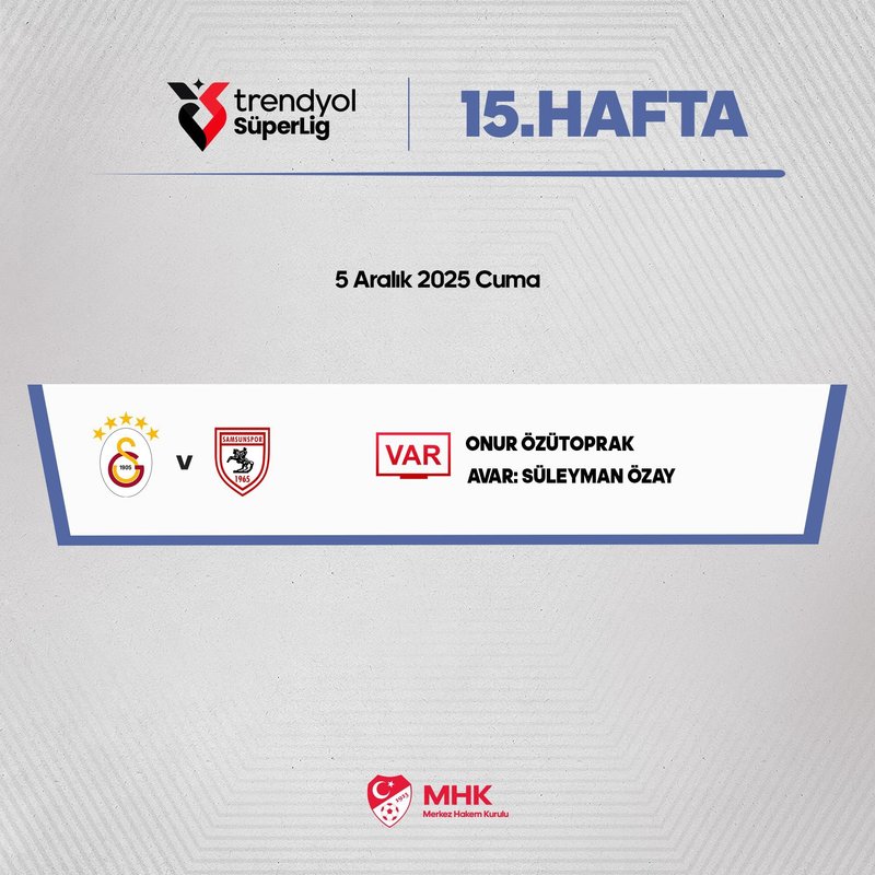 Trendyol Süper Lig'de 15. haftanın açılış mücadelesi olan Galatasaray–Samsunspor maçının video yardımcı hakem atamaları belli oldu.