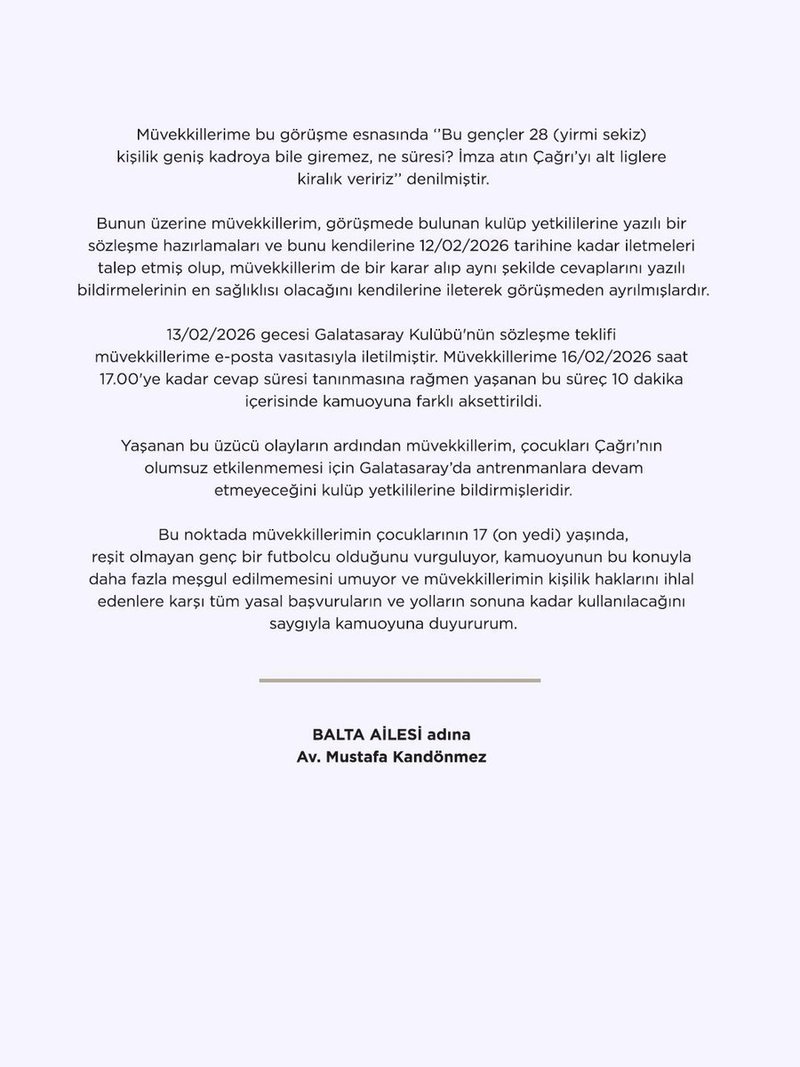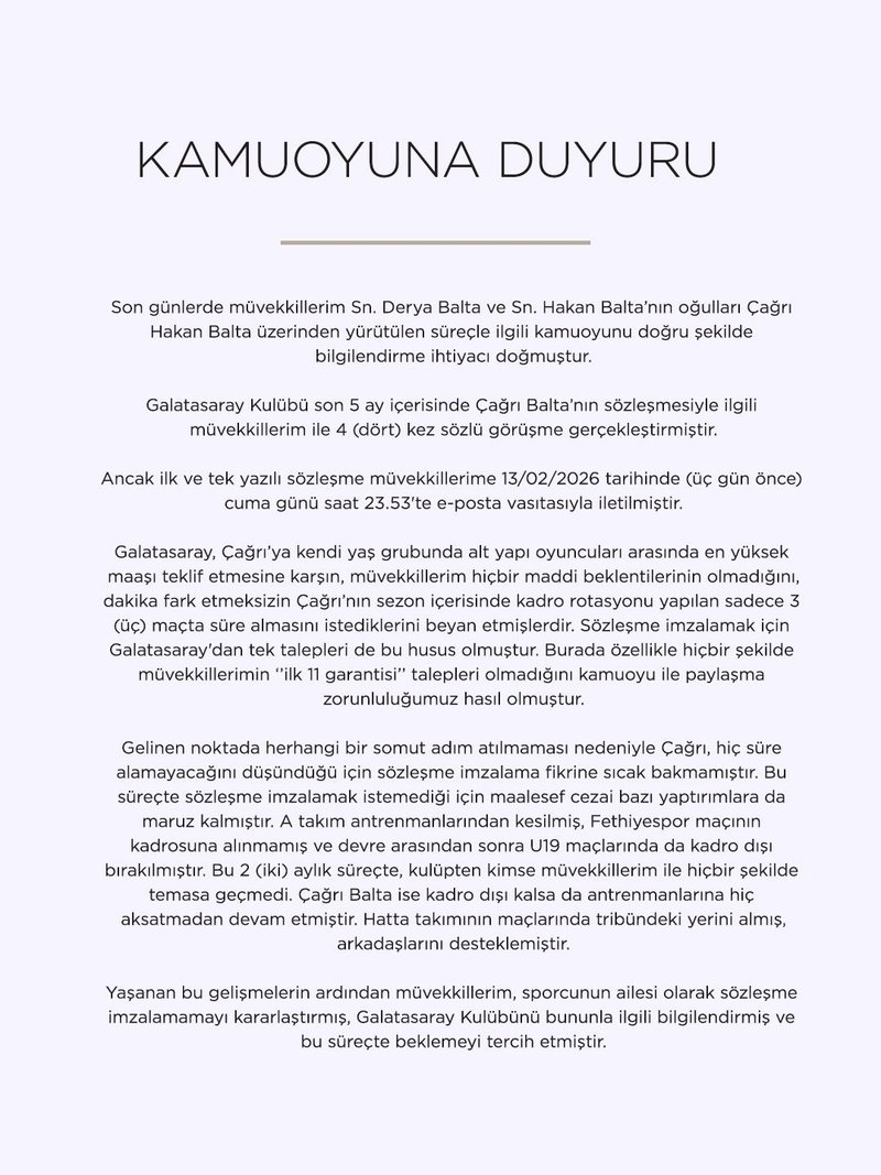 "Galatasaray, Çağrı'ya kendi yaş grubunda alt yapı oyuncuları arasında en yüksek maaşı teklif etmesine karşın, müvekkillerim hiçbir maddi beklentilerinin olmadığını, dakika fark etmeksizin Çağrı'nın sezon içerisinde kadro rotasyonu yapılan sadece 3 maçta süre almasını istediklerini beyan etmişlerdir. Sözleşme imzalamak için Galatasaray'dan tek talepleri de bu husus olmuştur."