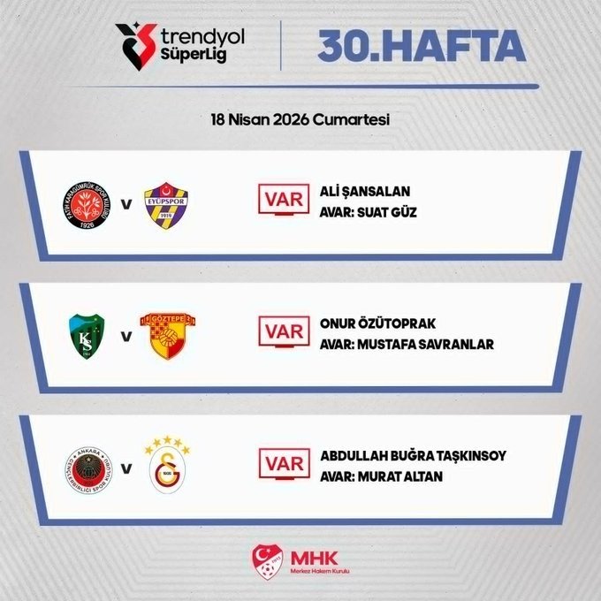 Trendyol Süper Lig'in 30. haftasında 18 Nisan Cumartesi günü oynanacak olan Natura Dünyası Gençlerbirliği-Galatasaray maçının VAR'ı Abdullah Buğra Taşkınsoy olarak açıklandı. Taşkınsoy'a AVAR'da ise Murat Altan eşlik edecek.