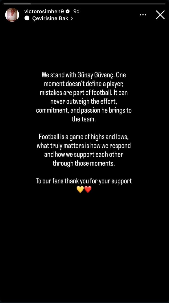 Nijeryalı yıldız sosyal medya hesabı üzerinden yaptığı paylaşıma, "Günay Güvenç'in yanındayız. Tek bir an, bir oyuncuyu tanımlamaz, hatalar futbolun parçasıdır. Bu, onun takıma kattığı emek, bağlılık ve tutkuyu asla gölgeleyemez. Futbol inişleri ve çıkışları olan bir oyundur, asıl önemli olan bu anlara nasıl tepki verdiğimiz ve birbirimize nasıl destek olduğumuzdur. Taraftarlarımıza: Desteğiniz için teşekkür ederiz." notunu düştü.