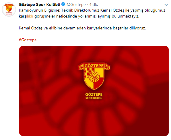 "Teknik Direktörümüz Kemal Özdeş ile yapmış olduğumuz karşılıklı görüşmeler neticesinde yollarımızı ayırmış bulunmaktayız.