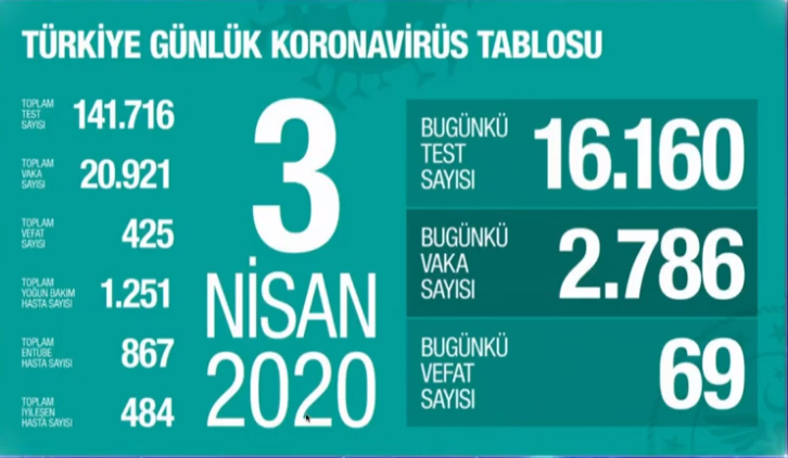 Sağlık Bakanı Fahrettin Koca 3 Nisan itibari ile 16 bin 160 kişiye test yapıldığını duyurdu. Yapılan test sonucunda 2 bin 286 hastanın test sonuncunun pozitif çıktığı açıklandı. Ayrıca 3 Nisan itibariyle 69 vatandaşımız hayatını kaybetti.