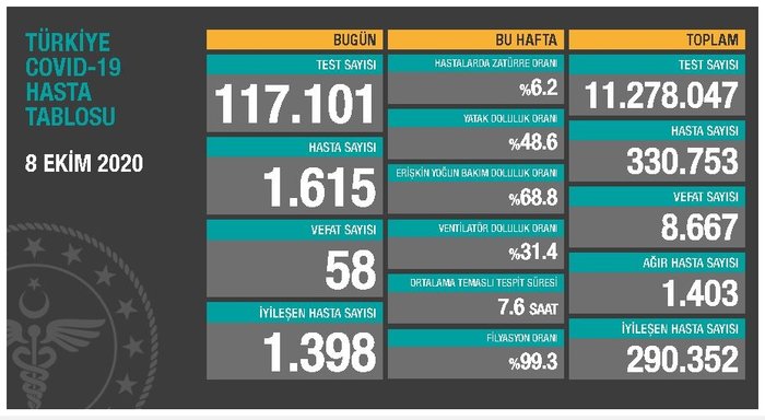 8 Ekim Perşembe günü 117 bin 101 test yapıldı. Bu testlerde 1.615 hastaya rastlandı. 58 vatandaşımız hayatını kaybederken, 1398 vatandaşımız sağlığına kavuştu. Tabloya göre, toplam test sayısı 11 milyon 287 bin 047, toplam hasta sayısı 330 bin 753, toplam vefat sayısı 8 bin 667, toplam ağır hasta sayısı 1403, hastalarda zatürre oranı %6.2, toplam iyileşen hasta sayısı 290 bin 352 oldu.