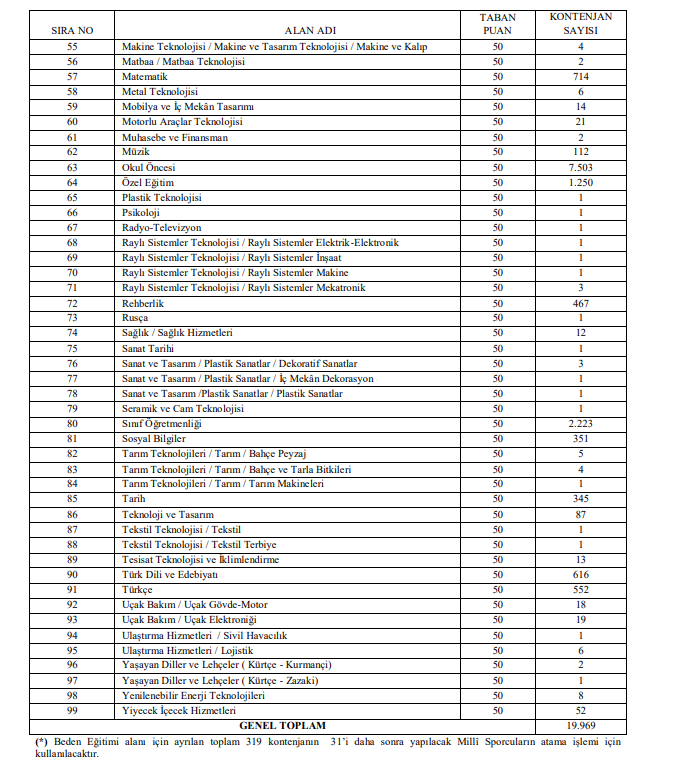 Milli Eğitim Bakanlığı'nın 1 Eylül'deki 20 bin öğretmen atamasına ilişkin alanlar, taban puanlar ve kontenjan listesi "www.meb.gov.tr" adresi üzerinden erişime açıldı. İşte atama yapılacak branşlar ve kontenjan sayıları...