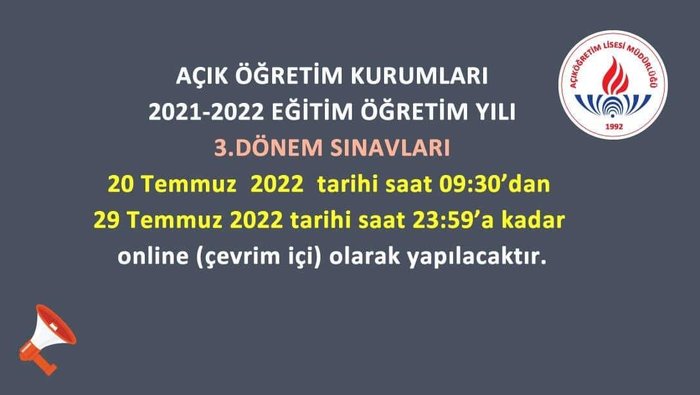 MEB tarafından gerçekleştirilen Açık Öğretim Ortaokulu (Açık Öğretim Lisesi), Açık Öğretim İmam Hatip Lisesi ve Mesleki Açık Öğretim Lisesi 3. Dönem Sınavları 20 Temmuz 2022 saat 09:30'dan - 29 Temmuz 2022 tarihi saat 23:59'a kadar tamamlanabilecek. AÖL sınavları online (çevrimiçi) gerçekleştirilecek.