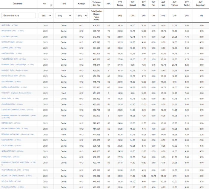 YÖK ATLAS TERCİH SİHİRBAZINA GÖRE 2021 YILI SINIF ÖĞRETMENLİĞİ TABAN VE TAVAN PUANLARI: