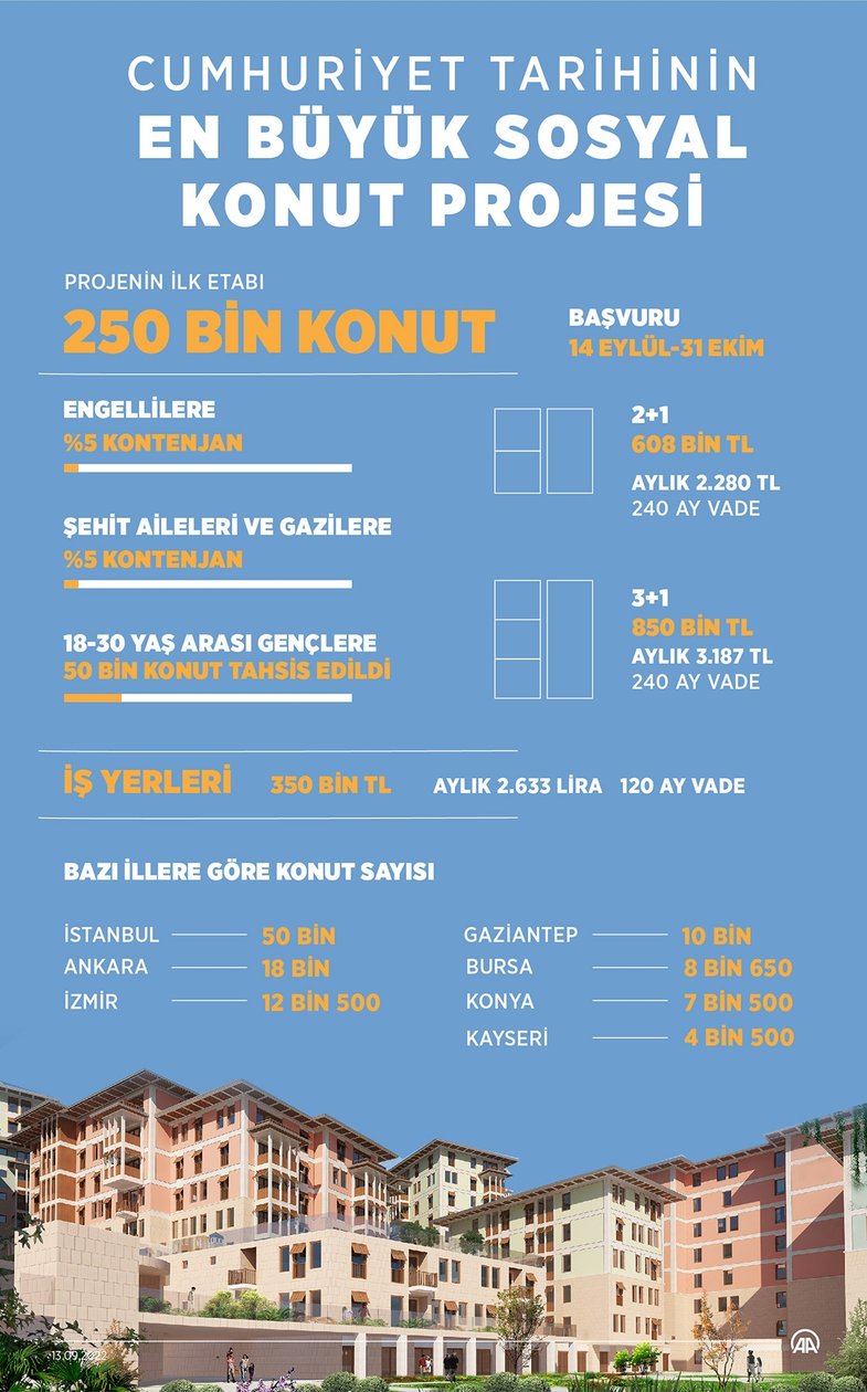 81 ilde yapılacak TOKİ sosyal konut projesi başvuru tarihleri belli oldu. Cumhuriyet tarihinin en büyük sosyal konut projesinin detayları, Başkan Recep Tayyip Erdoğan'ın 13 Eylül tarihinde yapacağı açıklama ile netleşti. Buna göre başvurular, 14 Eylül 2022 tarihinde başlayacak ve Ekim ayının sonuna kadar devam edecek.