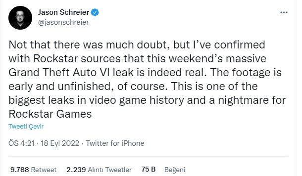 İddialar bir taraftan konuşulmaya devam ederken, oyun basınının en önemli isimlerinden biri olan Jason Schereier sızıntıyı doğruylayan bir tweet attı. Rockstar'daki kaynaklarıyla görüştüğünü belirten Schereier, sızdırılan görüntülerin gerçek olduğunu açıkladı.