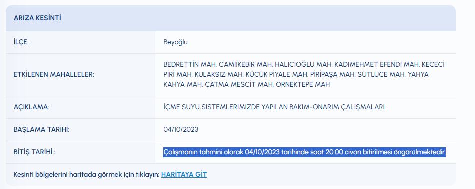 4 EKİM 2023 BEYOĞLU SU KESİNTİSİ | İstanbul Su ve Kanalizasyon İdaresi'nce yürütülen çalışmalar kapsamında, Beyoğlu'nda bazı mahallelerinde planlı olarak su kesintileri yapılacağı duyuruldu. Arıza kaynaklı yapılan çalışmalarda İSKİ, internet sitesinde suların gideceği mahalleleri tek tek bildirip vatandaşları uyarırken evde su olmadığını gören kişiler ise arama motorlarında 4 Ekim 2023 sular ne zaman gelecek? sorusunun cevabını araştırıyor. İşte İSKİ İstanbul Beyoğlu 4 Ekim Çarşamba günü planlı su kesintisi yaşanacak mahalleler...