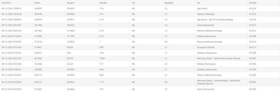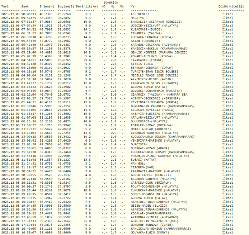 Kandilli Rasathanesi ve AFAD'ın resmi internet sitelerinde, yaşanan son depremlerin büyüklüğü, derinliği, saati ve merkezüssü ölçülerek kaydedilmektedir.