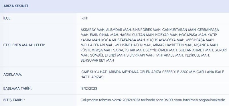 20 ARALIK 2023 FATİH SU KESİNTİSİ | İstanbul Su ve Kanalizasyon İdaresi'nce yürütülen çalışmalar kapsamında, Fatih'in bazı mahallelerinde planlı olarak su kesintileri yapılacağı duyuruldu. Arıza kaynaklı yapılan çalışmalarda İSKİ, internet sitesinde suların gideceği mahalleleri tek tek bildirip vatandaşları uyarırken evde su olmadığını gören kişiler ise arama motorlarında 20 Aralık 2023 sular ne zaman gelecek? sorusunun cevabını araştırıyor. İşte İSKİ İstanbul Fatih 20 Aralık Pazartesi günü planlı su kesintisi yaşanacak mahalleler...