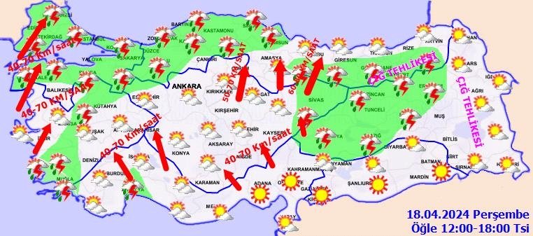 KUVVETLİ RÜZGAR UYARISI: Perşembe günü Orta ve Doğu Karadeniz'in İç Kesimleri (Amasya, Tokat, Çorum ile Sinop, Samsun, Ordu, Giresun ve Trabzon illerinin iç kesimleri) ile İç Anadolu'nun doğusunda (Sivas, Yozgat, Kayseri'nin doğusu, Aksaray ve Nevşehir) güney yönlerden kuvvetli rüzgar ve kısa süreli fırtına (50-70 km/saat kısa süreli 80 km/saat) beklendiğinden ulaşımda aksamalar, çatı uçması, soba ve doğalgaz kaynaklı zehirlenmeler gibi olumsuzluklara karşı dikkatli ve tedbirli olunmalıdır.
