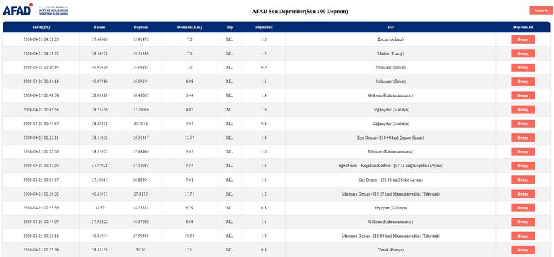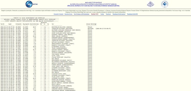 Kandilli Rasathanesi ve AFAD'ın resmi internet sitelerinde, yaşanan son depremlerin büyüklüğü, derinliği, saati ve merkezüssü ölçülerek kaydedilmektedir.